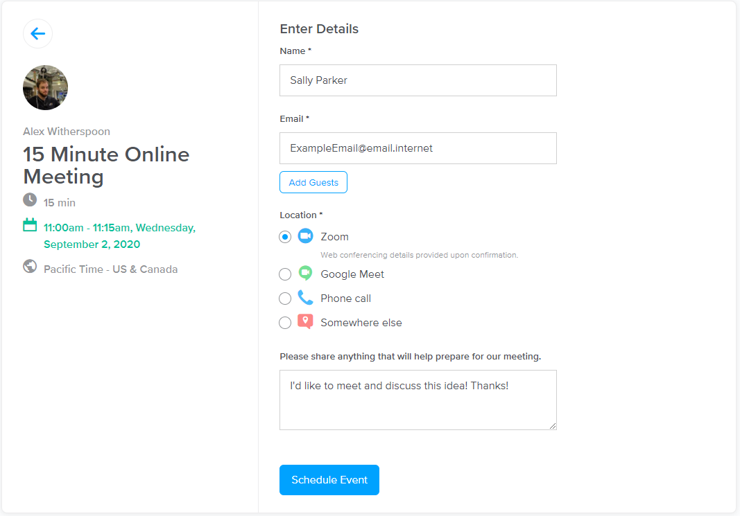 Once we have our status replicated across calendars, now the issue is how to have someone book time with you. There are a few good options here, but I truly prefer calendly.com - I use this myself at meetup.alexwitherspoon.com