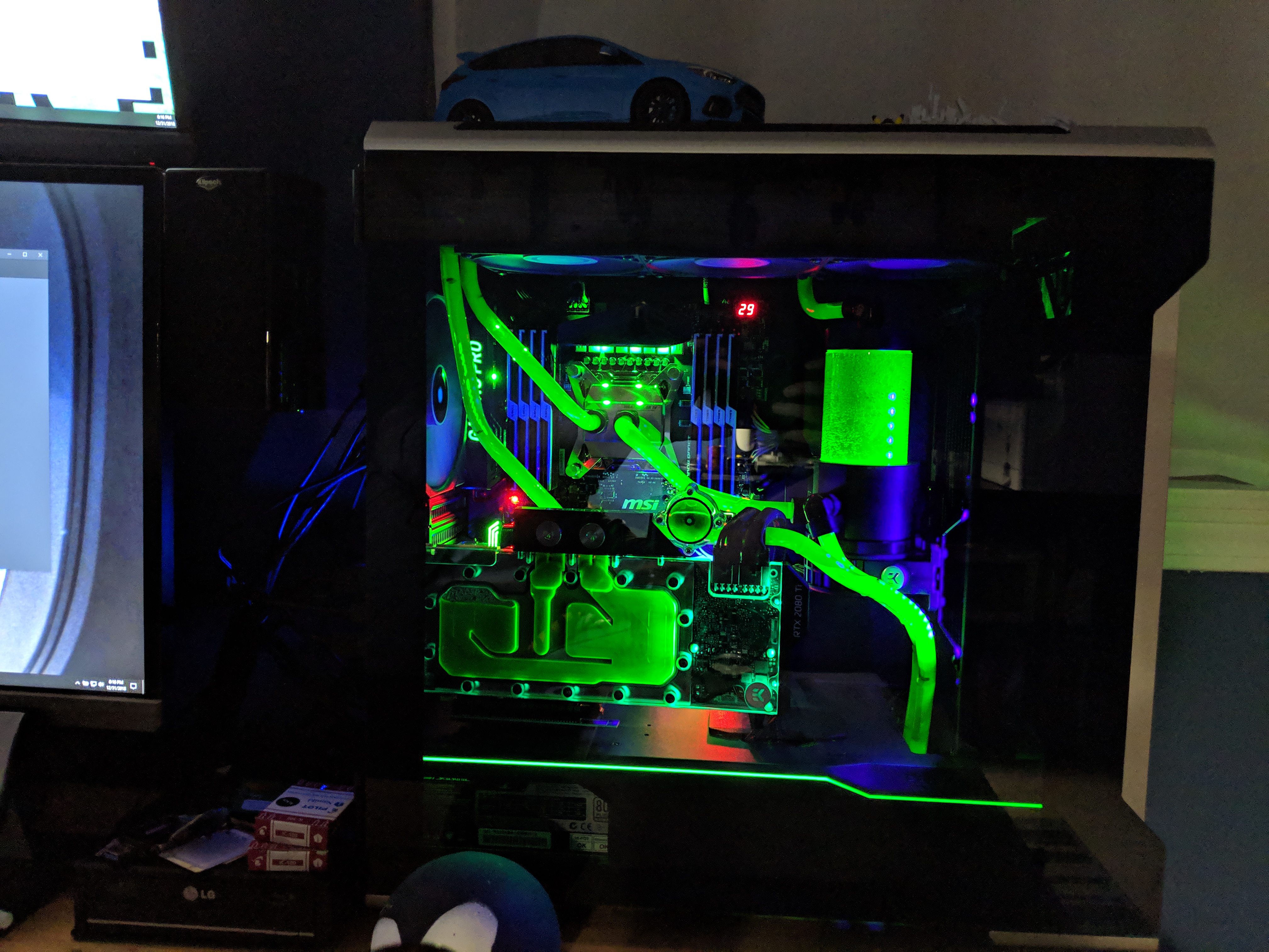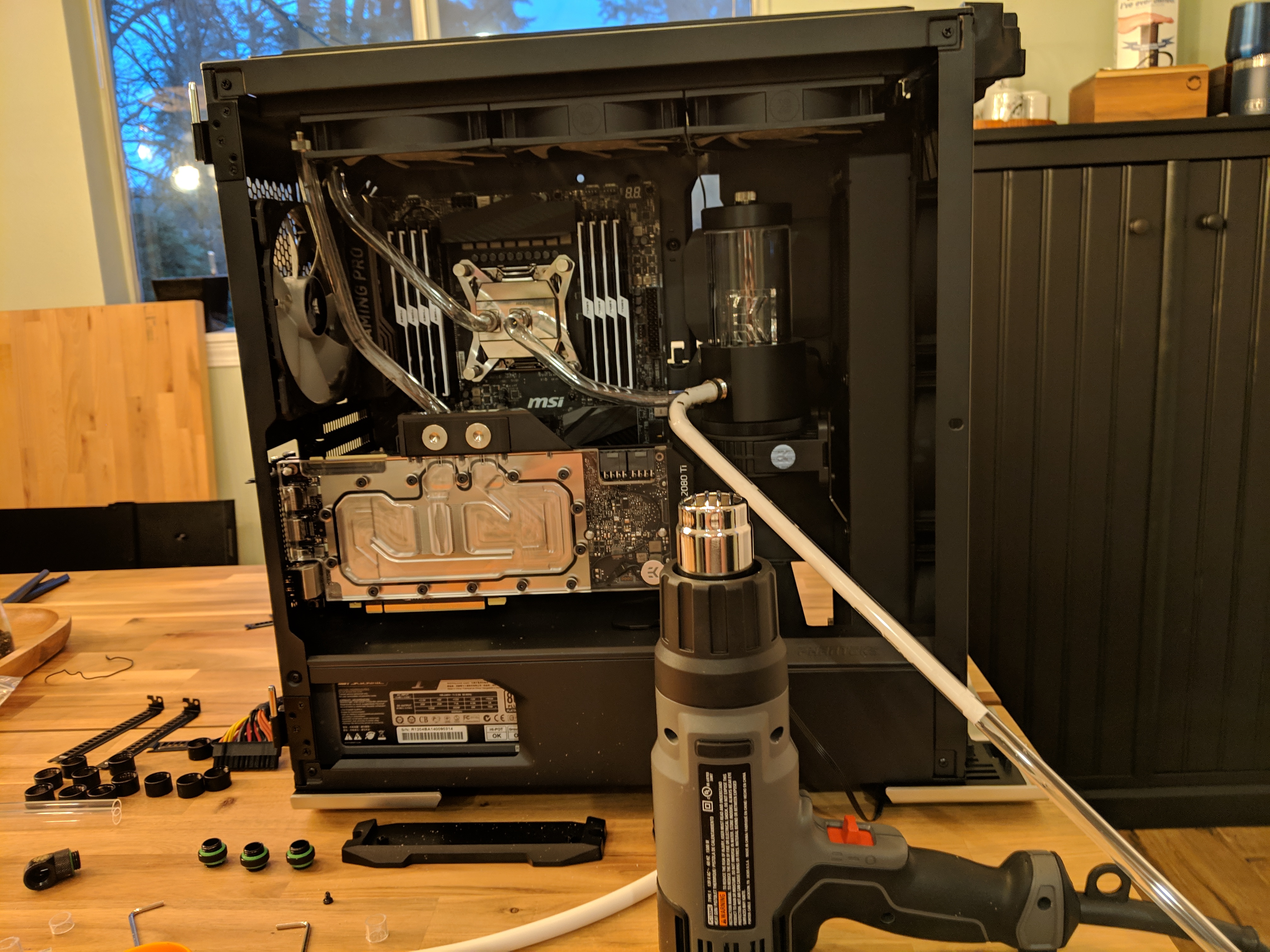 This was a GPU upgrade cycle, and many parts were carried over. I hadn’t bent hard line by hand for almost 10 years, so I was rusty, but it works, and I’ll probably bend new tubes in a few months. Everything is cooled by two 360 radiators, and 6 vardar 120mm fans. It’s a very quiet build with temperatures generally around 28c system, and 20c ambient. During gaming it’ll raise as high as 40c on the GPU die.