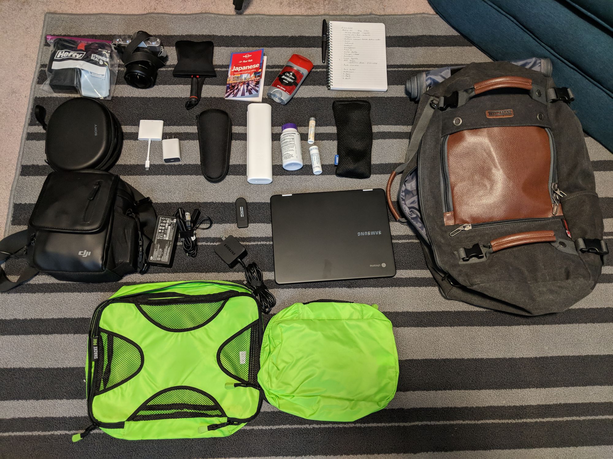 In getting ready to head to Japan, Ashley and I wanted to pack minimally. We will be staying for ~33 days in Japan, and wanted to pack 1 week worth of clothes with the intention to clean as we go along. We planned on staying for a week and a half in each general area, and day trip around. I made sure all my electronics were USB-C powered, or that they would not need charging while we were gone.