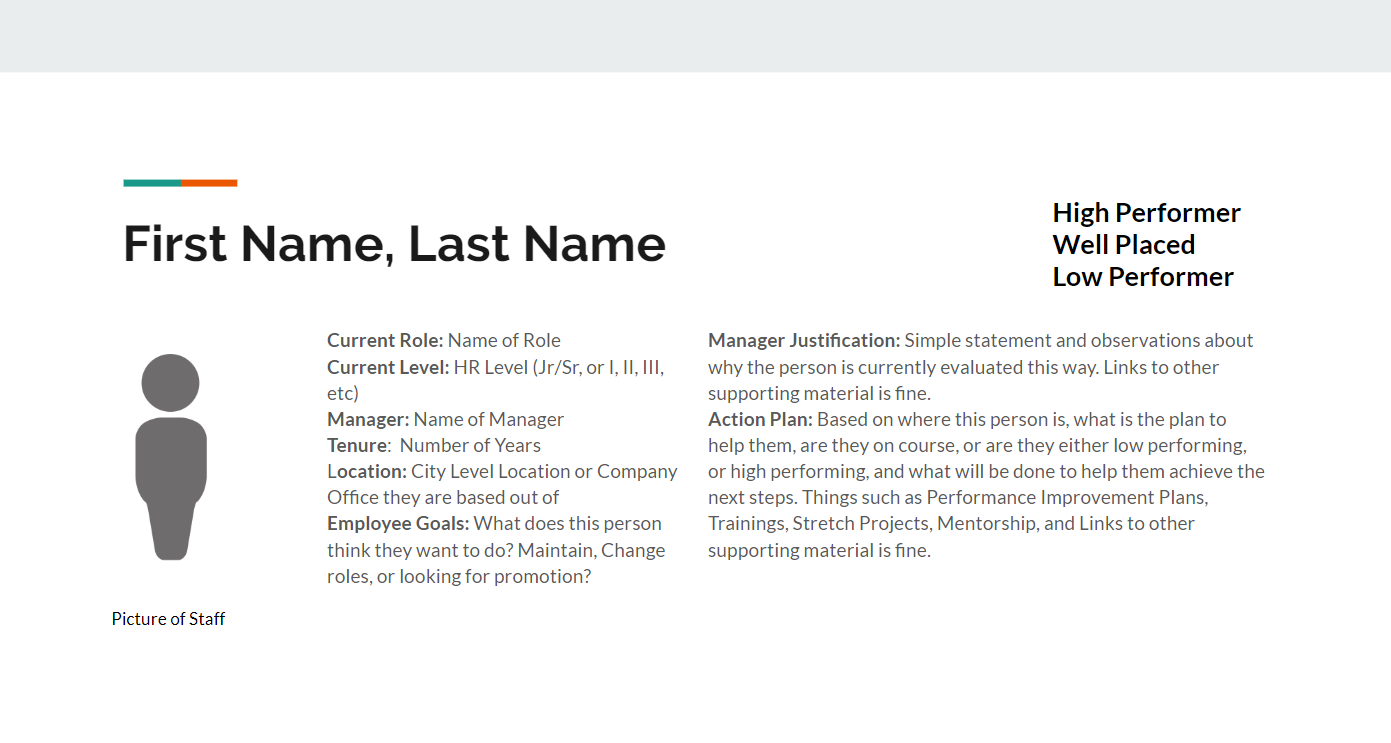 To really make this happen, we list out the staff in each category, and then we highlight and focus on describing the staff simply and effectively in the slide deck. This is the foundational information for a conversation to help determine the best actions to take with a person, such as confirming they are ready for a promotion, or that a performance improvement plan makes sense. This conversation by it’s nature needs to be held confidentially, and with support of HR to make sure it’s facilitated well. When this is used properly, it allows for frequent honest conversation about how staff are doing, how to support them better, and help advocate and evangelize them when it makes sense to do so with leadership.