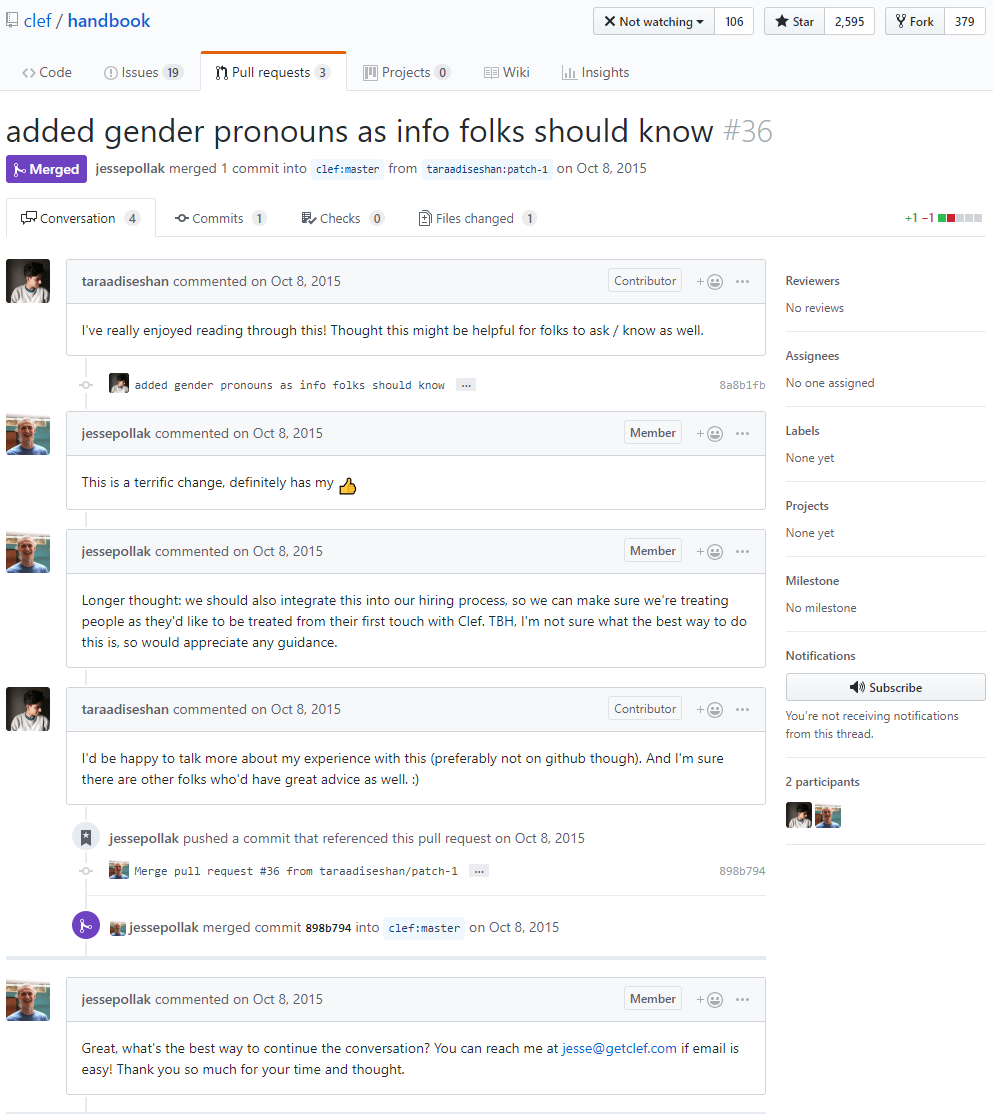 You can check out this example on GitHub here: https://github.com/clef/handbook/pull/36